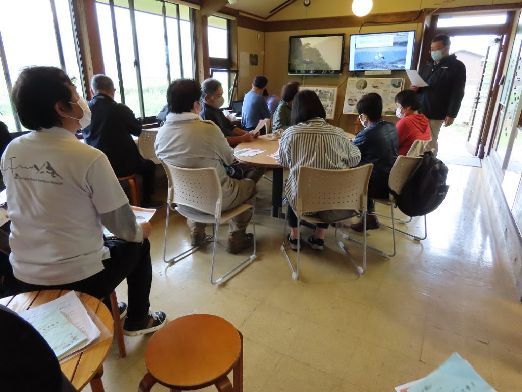 雨天により、戸島湿地で講師の方のお話しを聞き懇談されました。