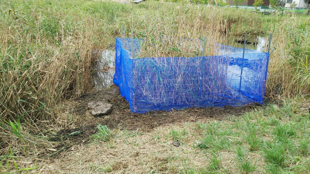 本日、戸島湿地汽水域にて、絶滅危惧種である「ヒヌマイトトンボ」の保護地を制作しました。