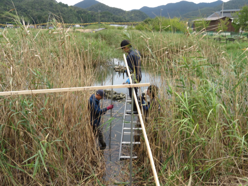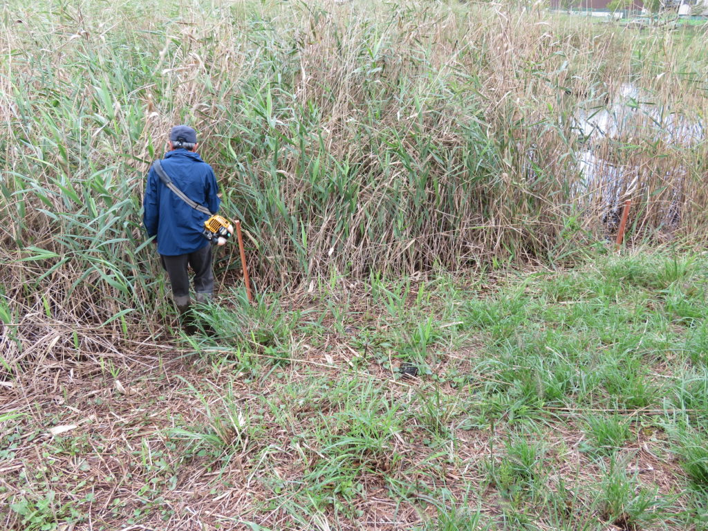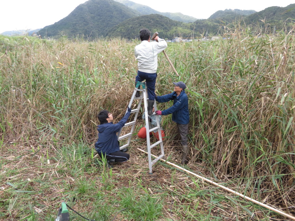 まず、周辺の葦を刈り取り、支柱を建てるためのスペースを作り
