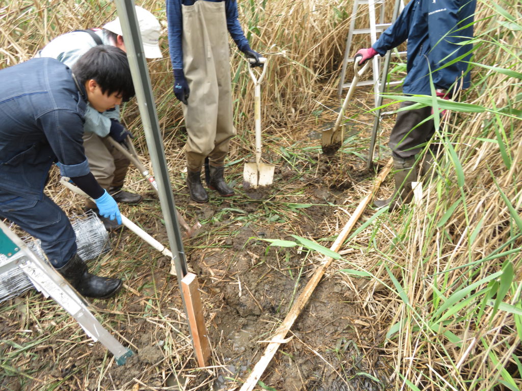 地中からウシガエルなどの外来生物が侵入できないよう、網を埋めるための穴を掘り
