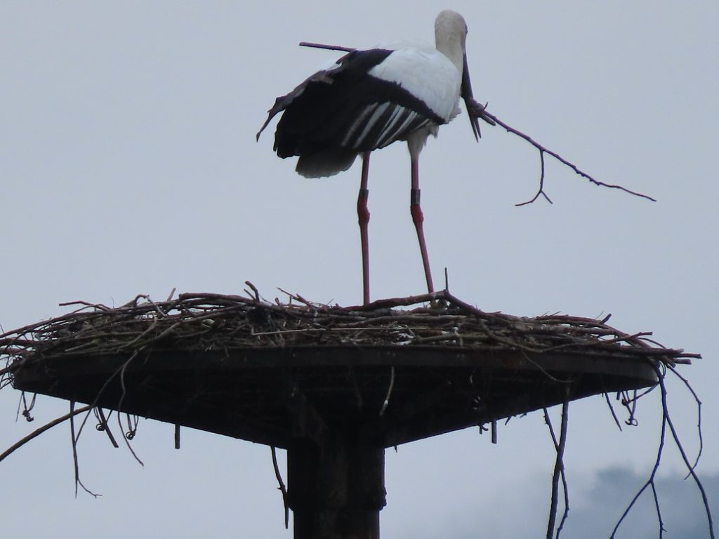 今朝はJ0122が戸島人工巣塔に降りて枝を咥え電柱(昨年営巣した)に運びました。