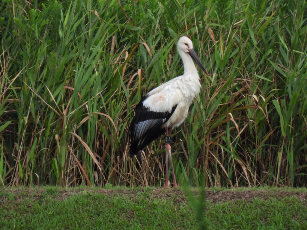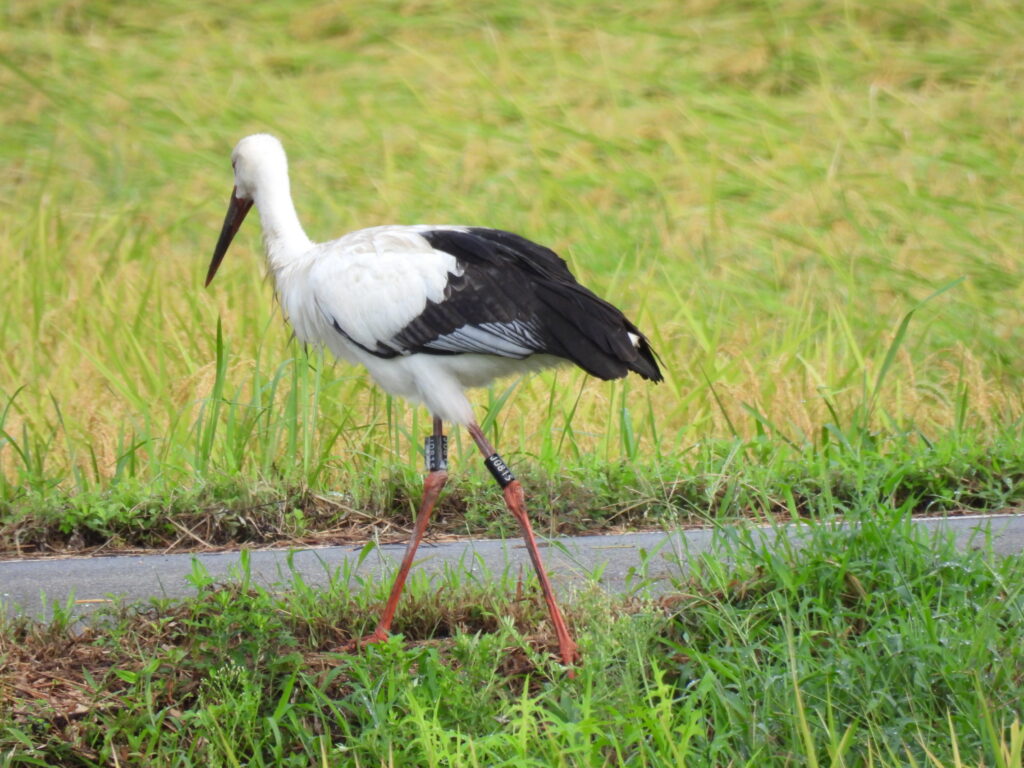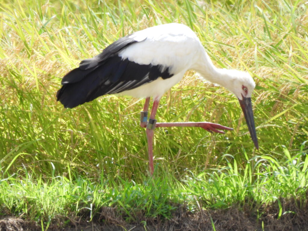 お昼になっても幼鳥たちが戸島湿地に戻ってこなかったので、スタッフが確認に行くとJ0103が稲刈り後の田んぼの畔で採餌行動していました。