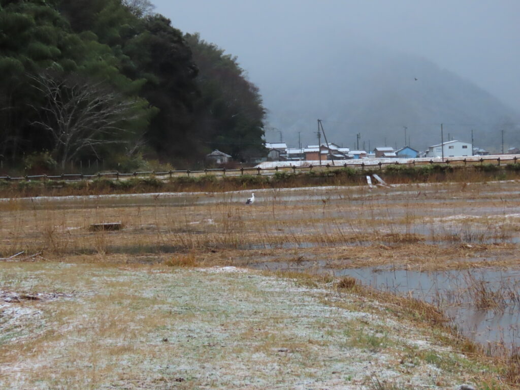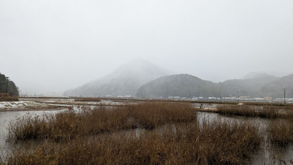 朝の時点では戸島湿地の積雪はほとんどありませんでしたが、少し南の下鶴井地域や、来日〜奈佐小橋あたりでは雪が積もり、豊岡市街地も落ち着いた量ながら積もっているようです。