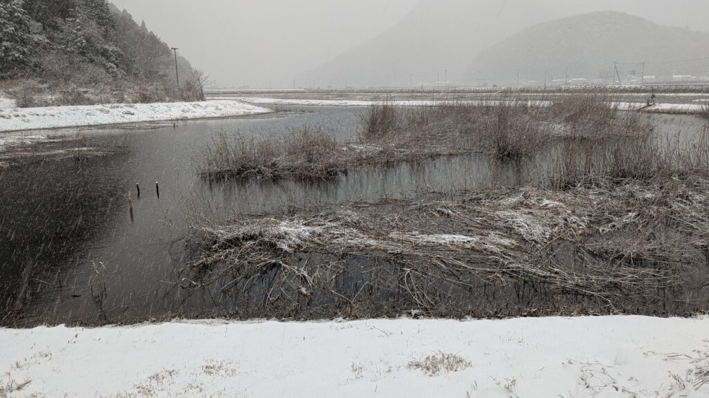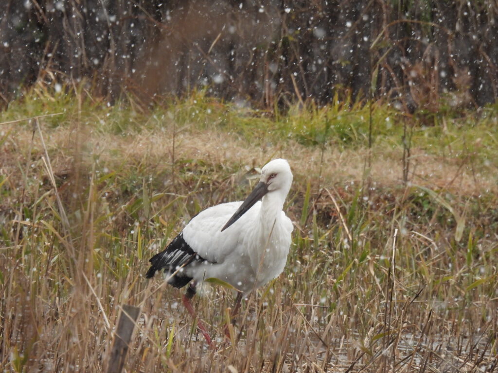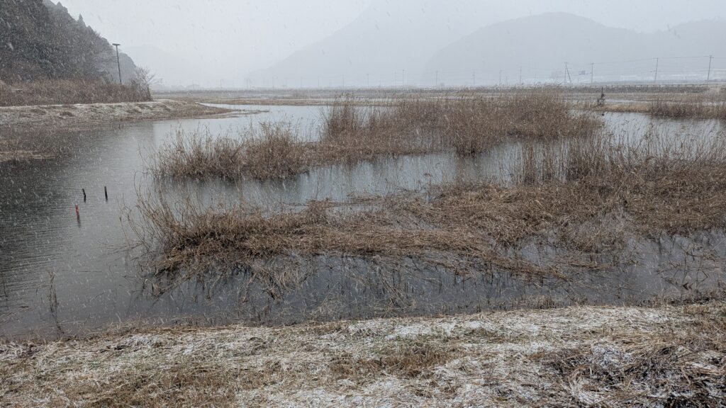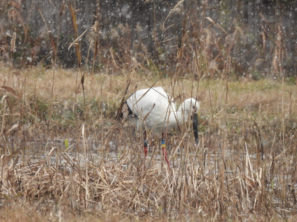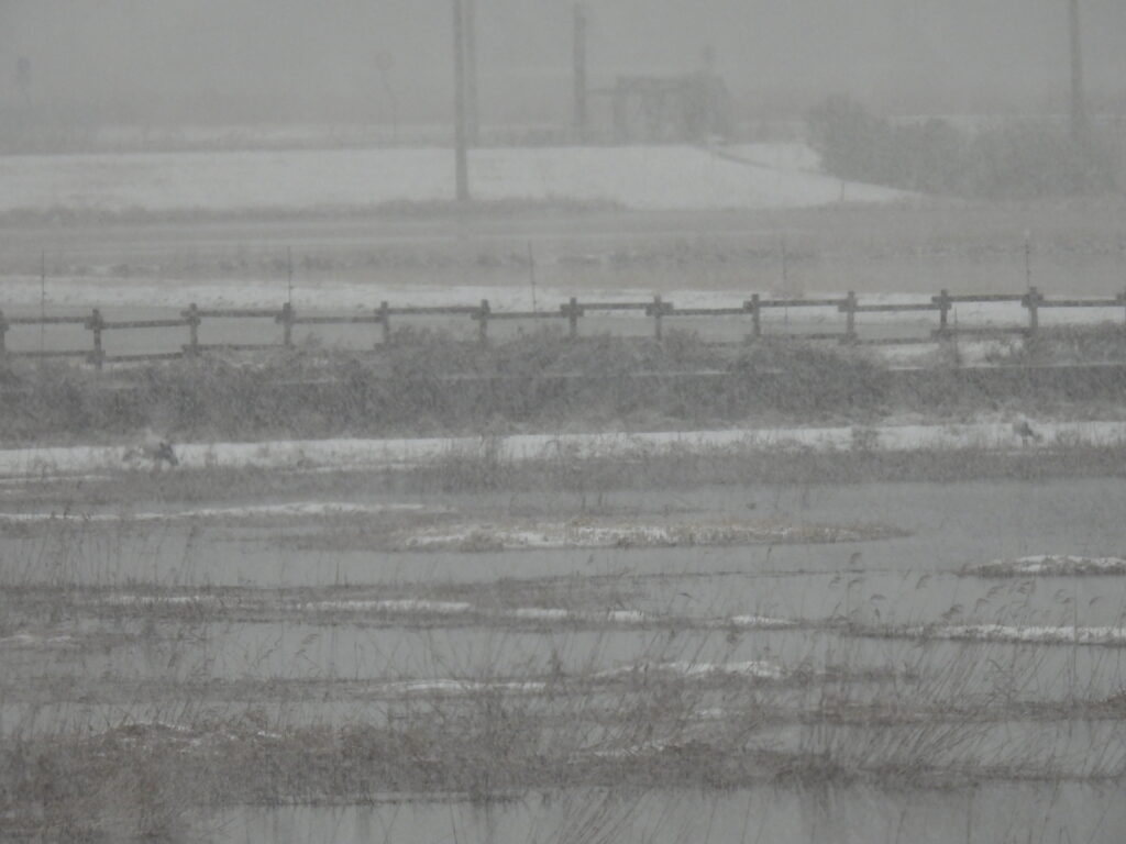 戸島ペアは、朝は湿地の淡水域で採餌をしていましたが、雪が強まるにつれて次第に省エネモードに。