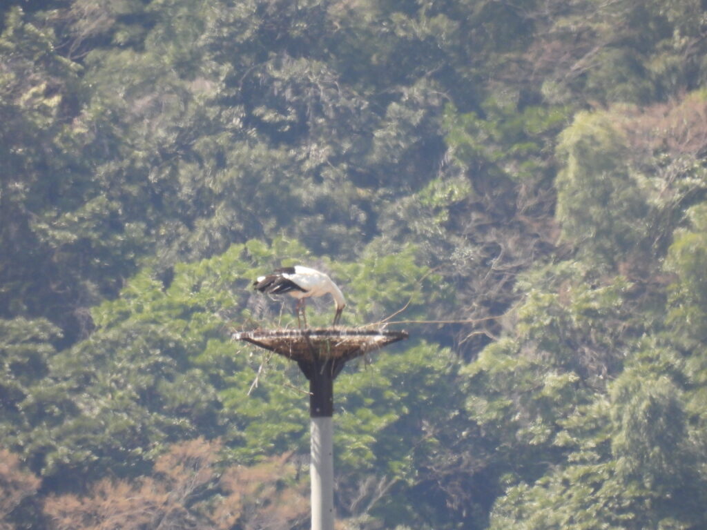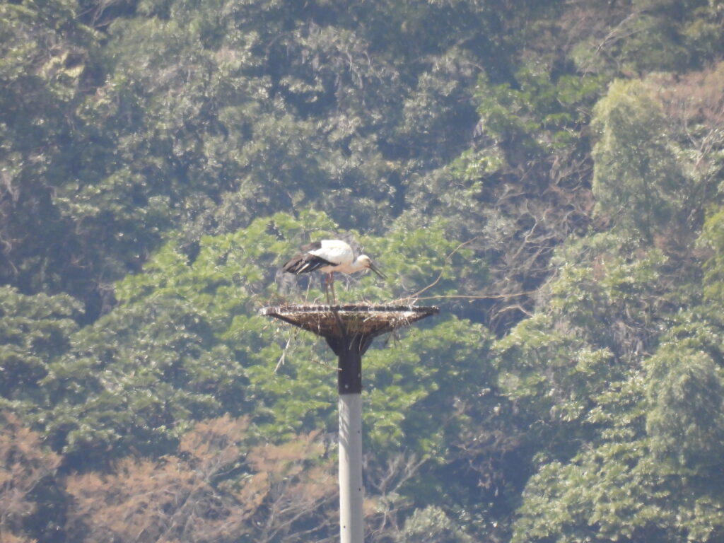 本日11:30、戸島地区巣塔にて、ペアのオス J0211 が餌を吐き出し行動を確認しました。